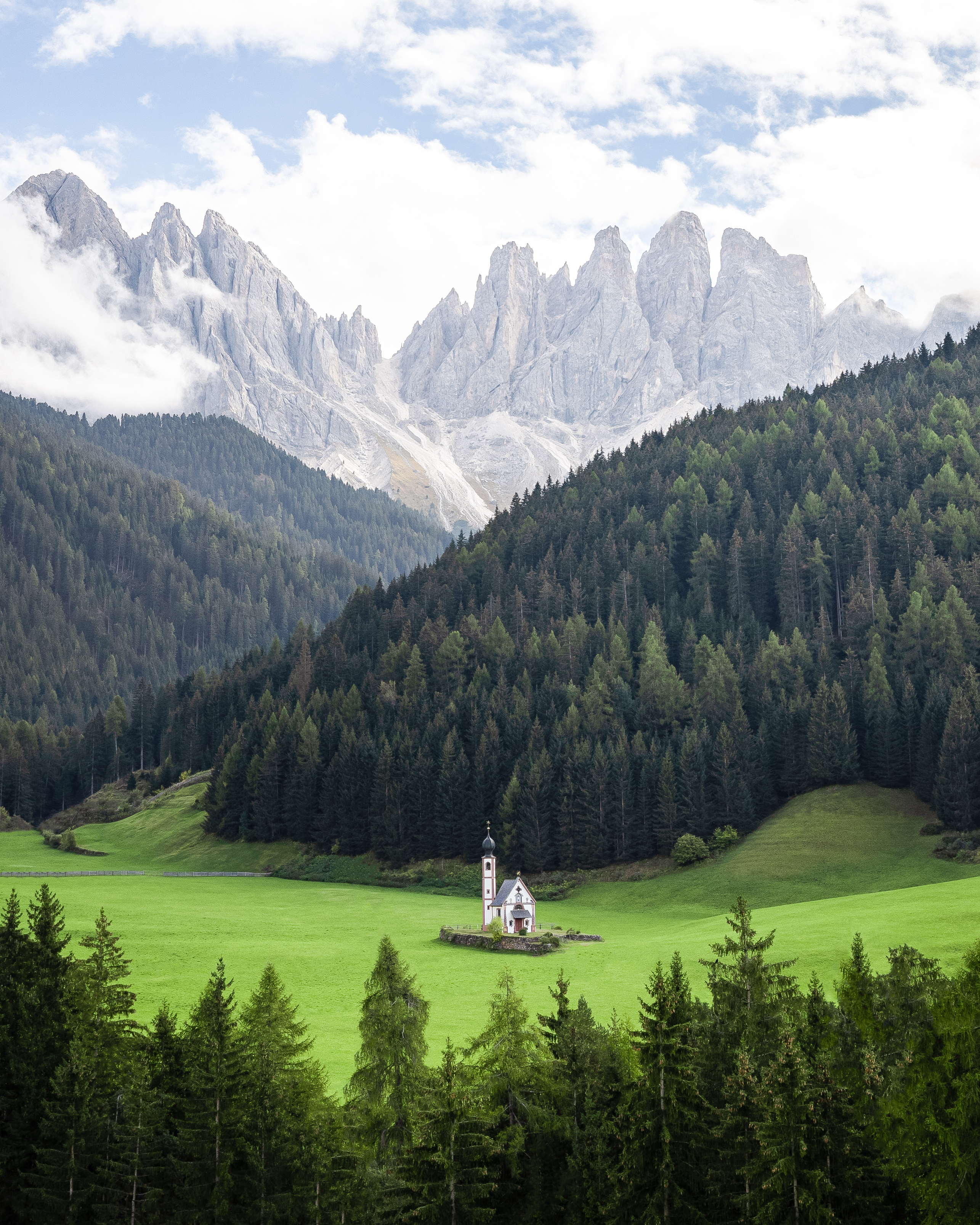 Perdue au cœur des Dolomites, cette petite chapelle semble veiller seule sur la vallée. J’ai passé la nuit juste en face, dans mon van, bercé par un orage qui n’en finissait plus. Le matin venu, pas de lever de soleil, la pluie tombait encore, tenace. Après un café bien chaud et quelques heures à attendre que le ciel se calme, j’ai enfin pu sortir. L’air était frais, l’herbe brillait, gorgée d’eau, et la chapelle, encore plus belle dans cette humidité lumineuse, se dressait fièrement.