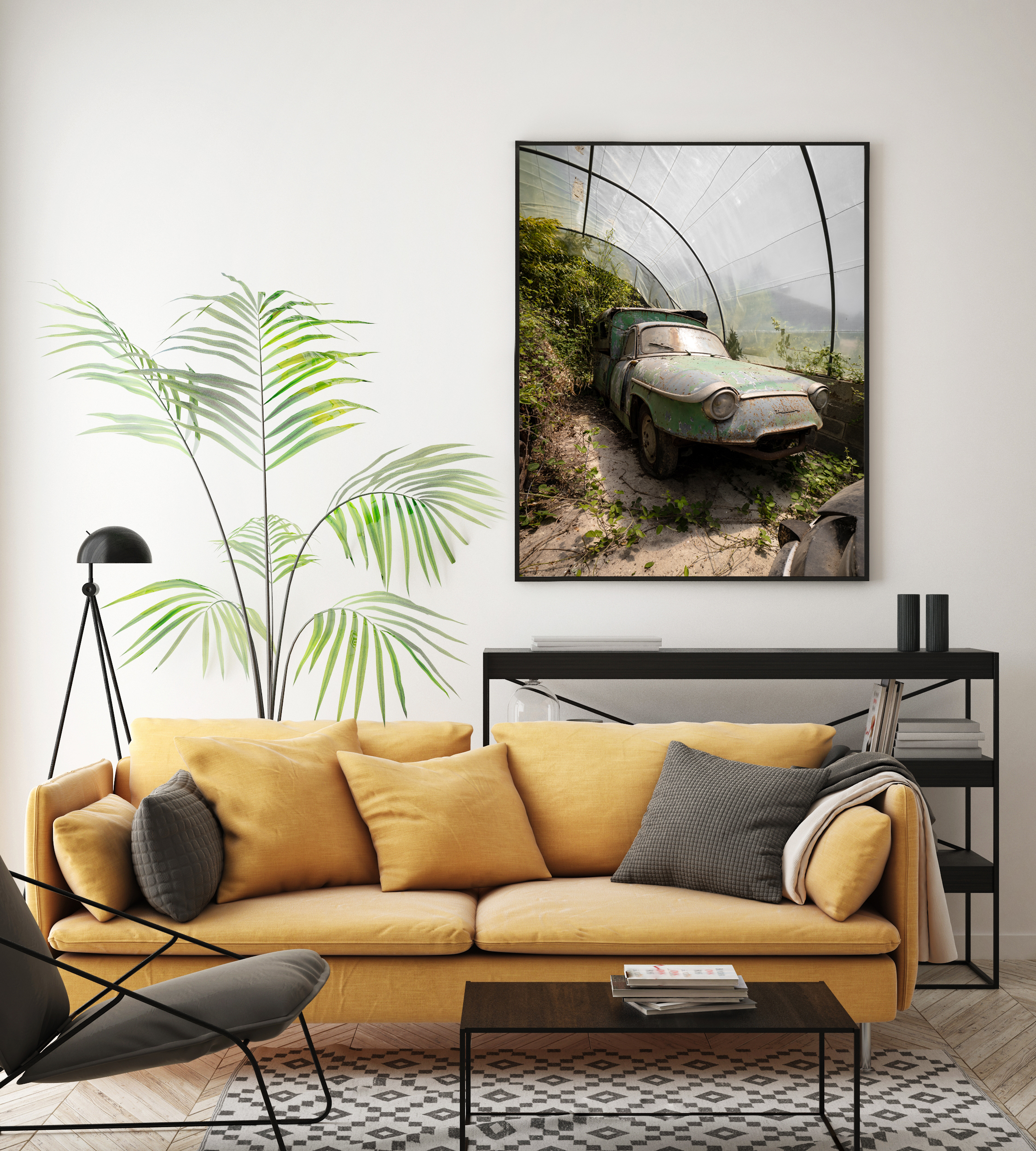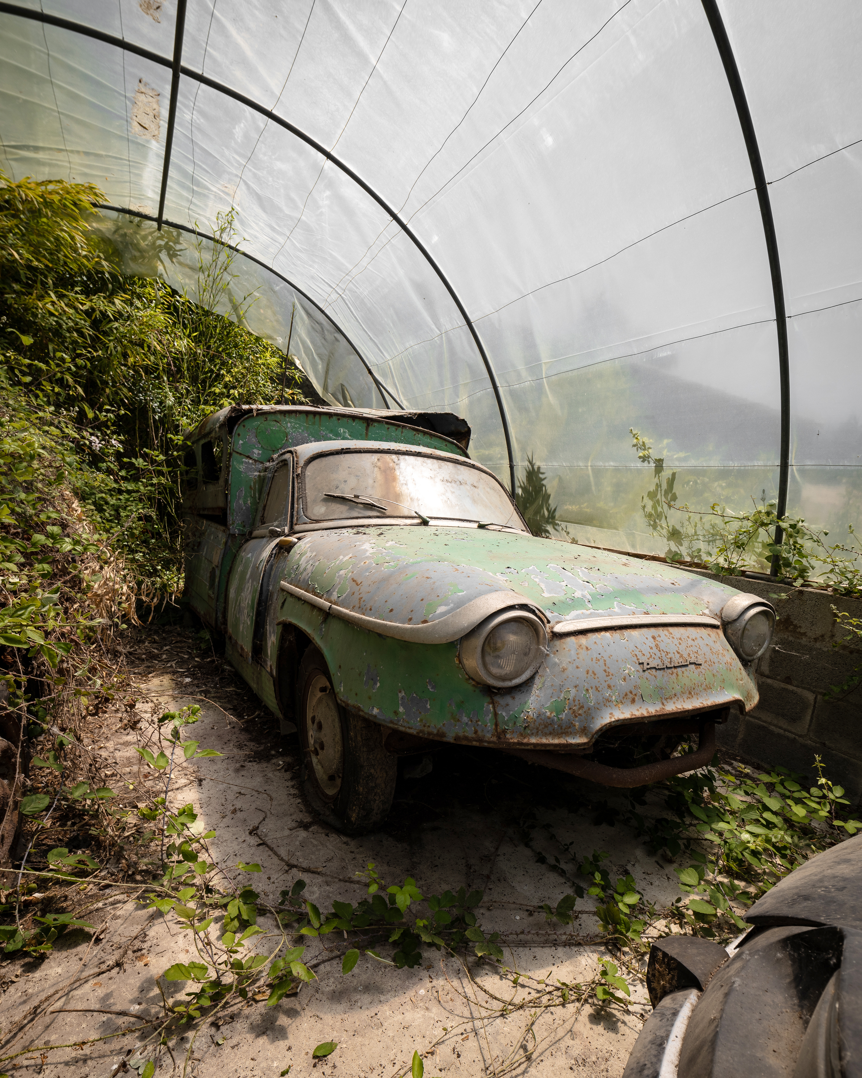 Je déambule entre les carcasses et les châssis rouillés, jusqu’à tomber sur une serre en plastique, discrète, nichée à l’arrière du terrain. À l’intérieur, l’humidité, la lumière tamisée et les plantes envahissantes dessinent une atmosphère irréelle. Sous ce dôme translucide, sommeille une Panhard, doucement avalée par la végétation. Une poignée d’autres sont encore visibles derrière, comme une collection oubliée, presque dissimulée.